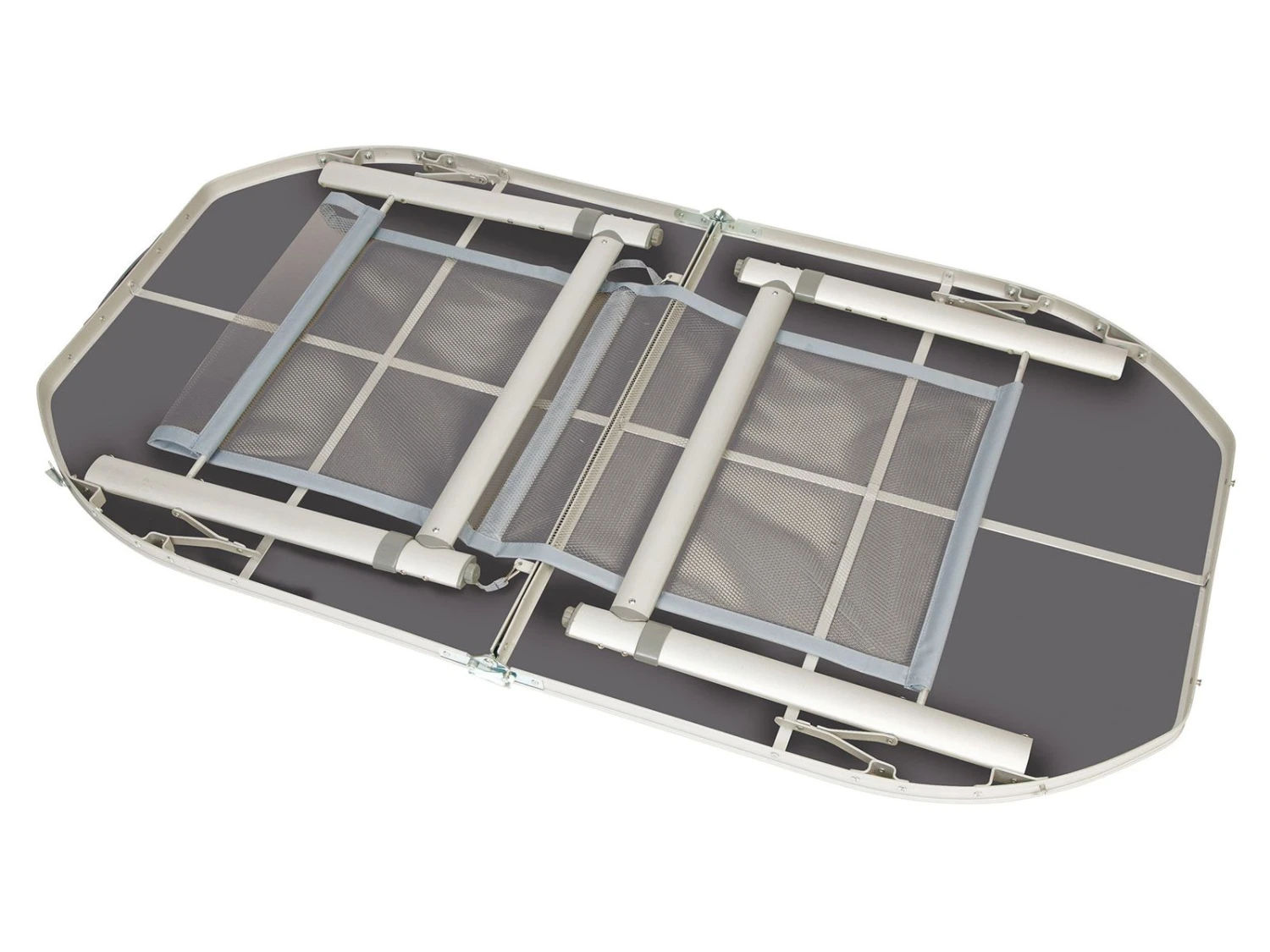 Dankzij het deelbare blad is deze ovale tafel in te klappen als koffer. De tafel is gemaakt van lichtgewicht aluminium met een MDF blad. Onder het tafelblad is een net bevestigd om spullen op te bergen.