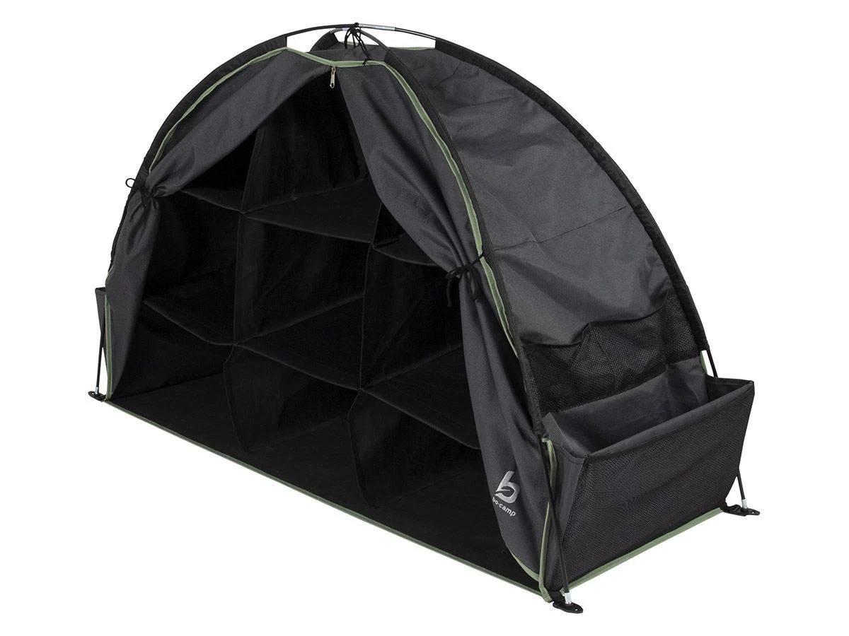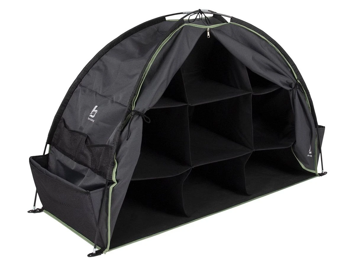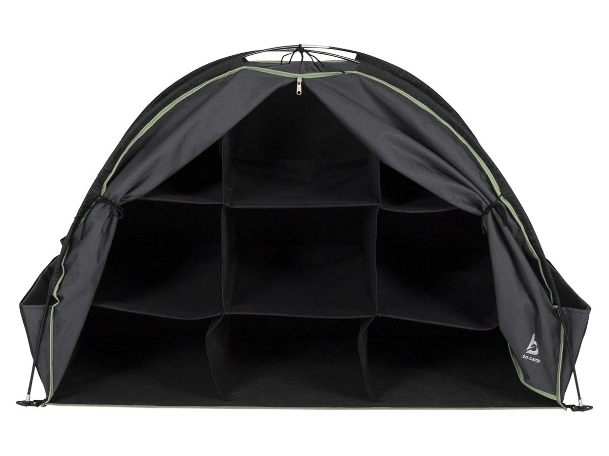 De Bo-Camp boogkast is voorzien van meerdere vakken die eenvoudig zijn af te sluiten met een ritssluiting. Aan de zijkant bevinden zich nog meer handige opbergvakjes waardoor jij alle camping spullen overzichtelijk kunt opbergen.