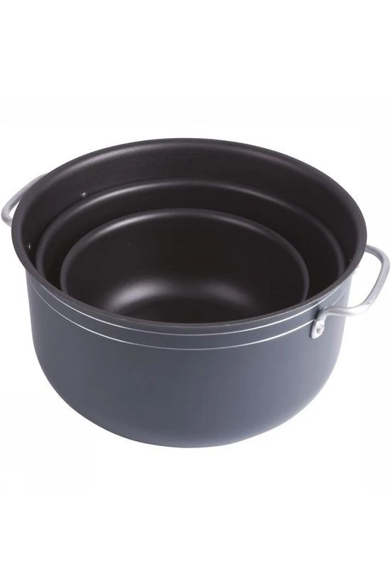 Zware en lastig op te bergen pannen is verleden tijd met de pannen van Bo-Camp. Met deze compacte 7-delige set ben je van alle kookgemakken voorzien. Deze set is in één compact geheel op te bergen. De set bevat 3 kookpannen, 2 koekenpannen, een afgietdeksel en een losse pannengreep. De pannen zijn gemaakt van aluminium, waardoor de pannen van lichtgewicht en van uitstekende kwaliteit zijn. Door de meegeleverde opberghoes en de in elkaar te plaatsen pannen is de set makkelijker op te bergen. De buitenkant is voorzien van een poedercoating aan de buitenkant en een anti-aanbaklaag aan de binnenzijde.