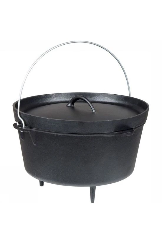 De Bo-Camp Urban Outdoor Dutch Oven 9QT Gietijzer is een traditionele en multifunctionele gietijzeren pan. Deze Dutch Oven is uitermate geschikt voor het bereiden van maaltijden boven open vuur of op hete kolen. Het massieve gietijzer zorgt voor een optimale warmteverdeling zodat de pan zonder problemen kan worden gebruikt om te bakken, braden, frituren, koken of stoven. De pan is voorzien van een ‘pre-seasoned’ coating tegen aanbakken en roesten. De pan kan ook worden gebruikt als oven door ook gloeiende houtskoolbriketten op het deksel te plaatsen. Aan de onderkant bevinden zich drie pootjes zodat de pan stabiel in het vuur kan worden geplaatst. De Dutch Oven is voorzien van een hengsel om de pan op te hangen aan een driepoot.