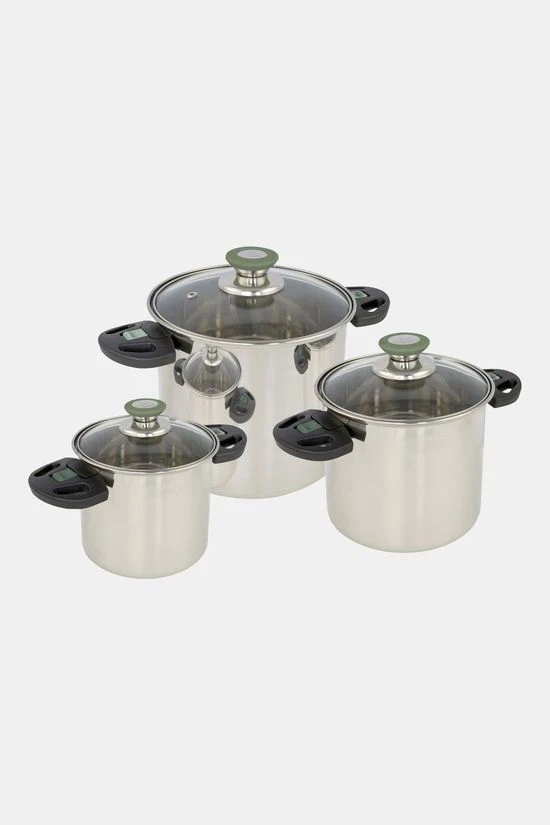 - De Bo-Camp Pannenset Elegance Compact 3 3-Delig RVS is een luxe 3-delige RVS pannenset.