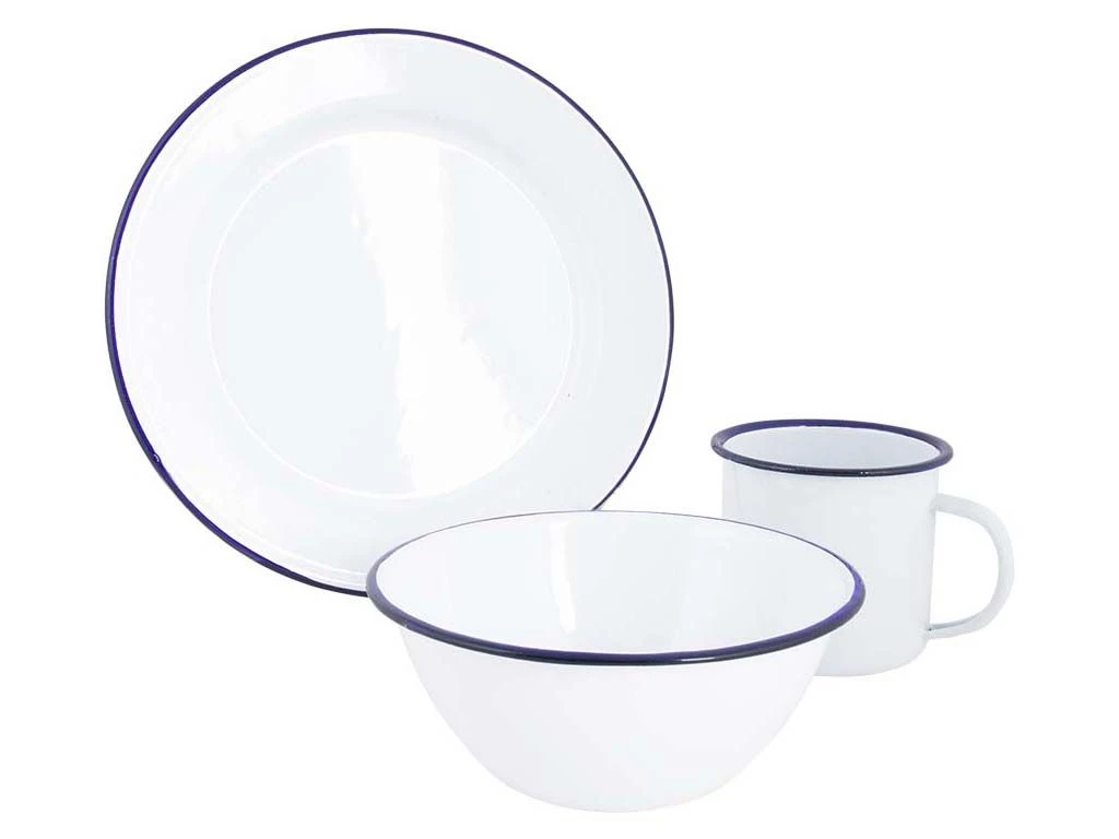 Een stevige stalen 6-delige serviesset gedecoreerd met een blauwe rand. De set is geëmailleerd, dus voorzien van een harde emaille laag die zorgt voor extra hygiëne en stevigheid. Tevens is emaille hittebestendig en duurzaam. Deze set is geschikt voor 2 personen en bestaat uit 2 borden Ø 26 cm , 2 kommen 700 ml en 2 mokken 370 ml.