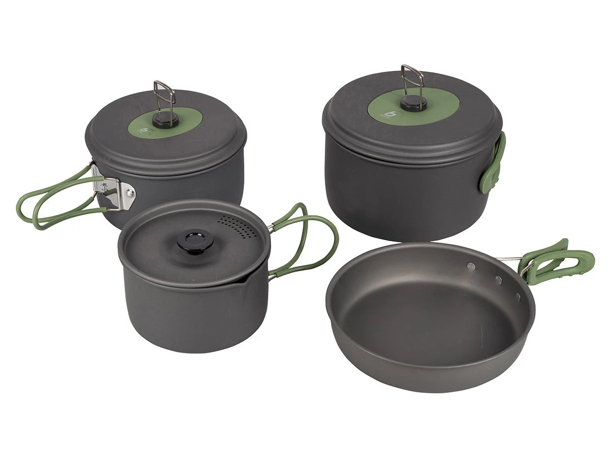 Om ruimte te besparen past er een gas cartouche binnen in de set pannen.
