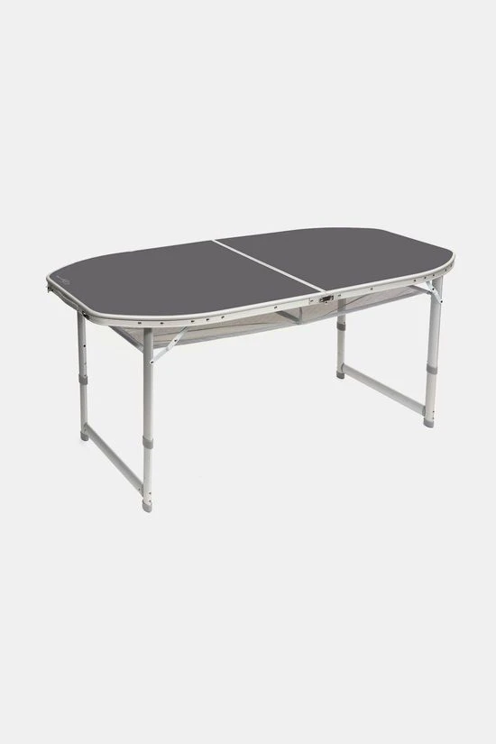 De Bo-Camp Tafel Ovaal Koffermodel 150×80 cm is een zeer stabiele ovalen campingtafel. Deze tafel heeft verstelbare poten, stelschroeven voor extra fijnstelling en een deelbaar tafelblad. Hierdoor is de tafel eenvoudig op te vouwen tot koffermodel (80 x 60 x 7 cm). De poten zijn in drie verschillende hoogtes verstelbaar (55, 65, 70 cm). De tafel is gemaakt van lichtgewicht aluminium. Onder het tafelblad is een net bevestigd om spullen op te bergen.