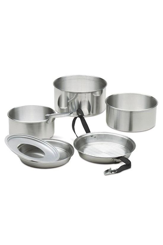 De Bo-Camp Safari is een 7-delige lichtgewicht kookset. Deze set bestaat uit 3 kookpannen, 2 koekenpannen, een stapelring en een pannengreep. Gemaakt van stevig en lichtgewicht aluminium. Deze aluminium pannen zijn te gebruiken op de warmtebronnen gas, keramisch en elektrisch. Deze set is volledig nestbaar en kan worden gebundeld door middel van het meegeleverde riempje.