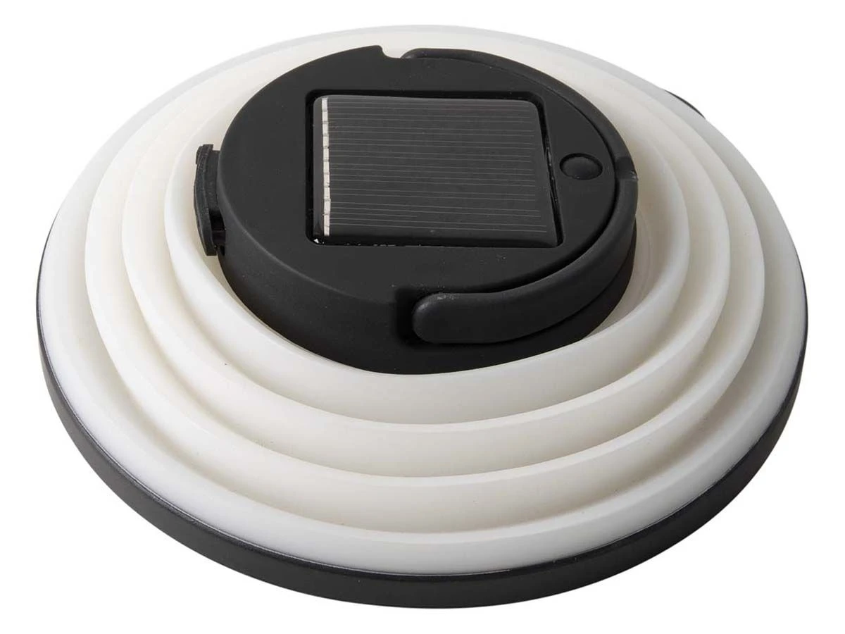 Een zeer compacte hanglamp met zonnepaneel. Deze lamp is extra plat opvouwbaar omdat de siliconen behuizing compleet in elkaar te vouwen is. Geeft een prettig licht door de warme witte LED verlichting met 4 lichtstanden. De ingebouwde Li-ion accu kan worden opgeladen met zonne-energie of meegeleverde USB kabel. Inclusief karabiner om de lamp op te hangen aan bijvoorbeeld een parasol of tent.