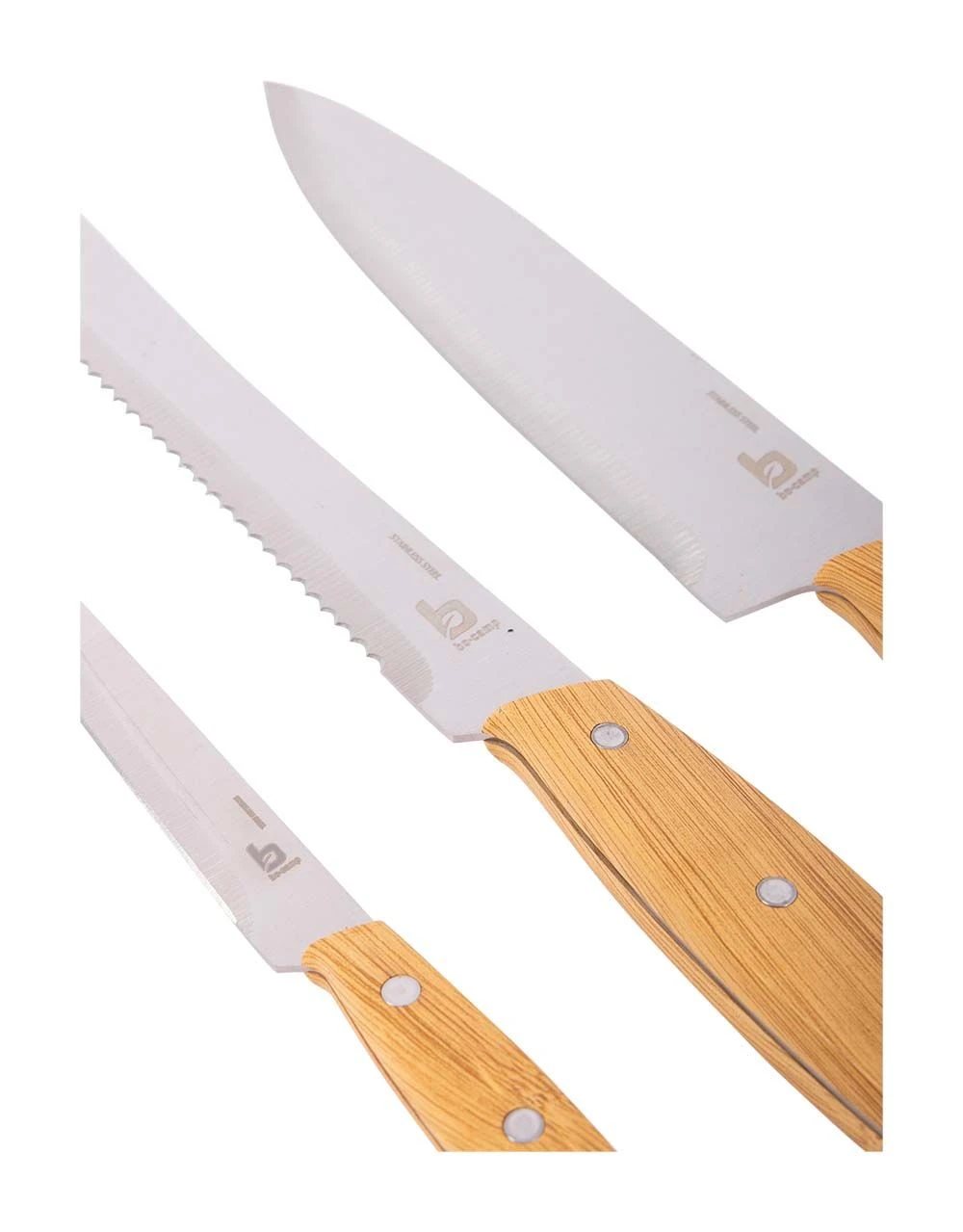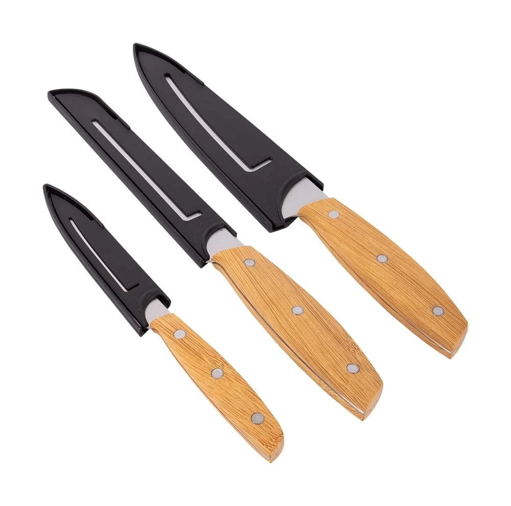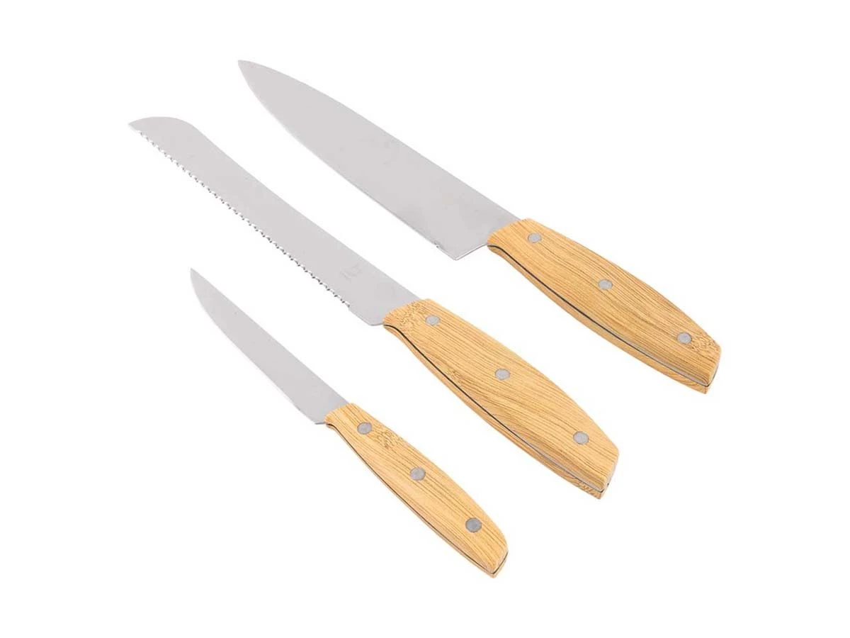 Een stijlvolle 3-delige messenset uit de Urban Outdoor collectie. Deze set bestaat uit 1x kokmes (25 cm), 1x broodmes (25 cm) en 1x schilmes (17 cm). Gemaakt van roestvrij staal met een bamboe look kunststof heft en de set heeft hierdoor een lange levensduur.