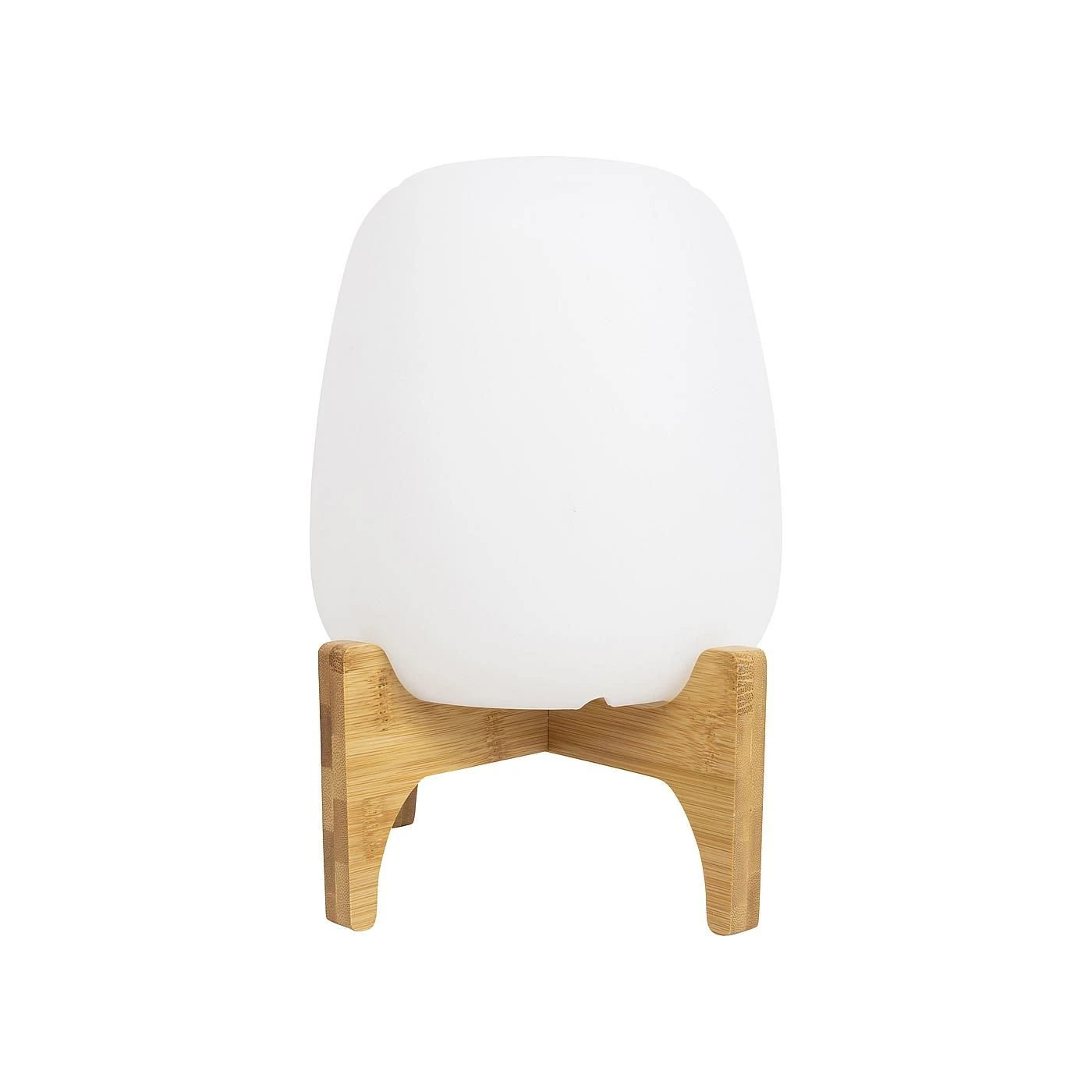 Een trendy tafellamp op losse bamboe voetstuk. Geeft een prettig licht door de LED’s met een warme lichtkleur en de witte matte kap. De lamp is te gebruiken in drie lichtstanden: 20%, 50% en 100%. De accu is op te laden via USB.
